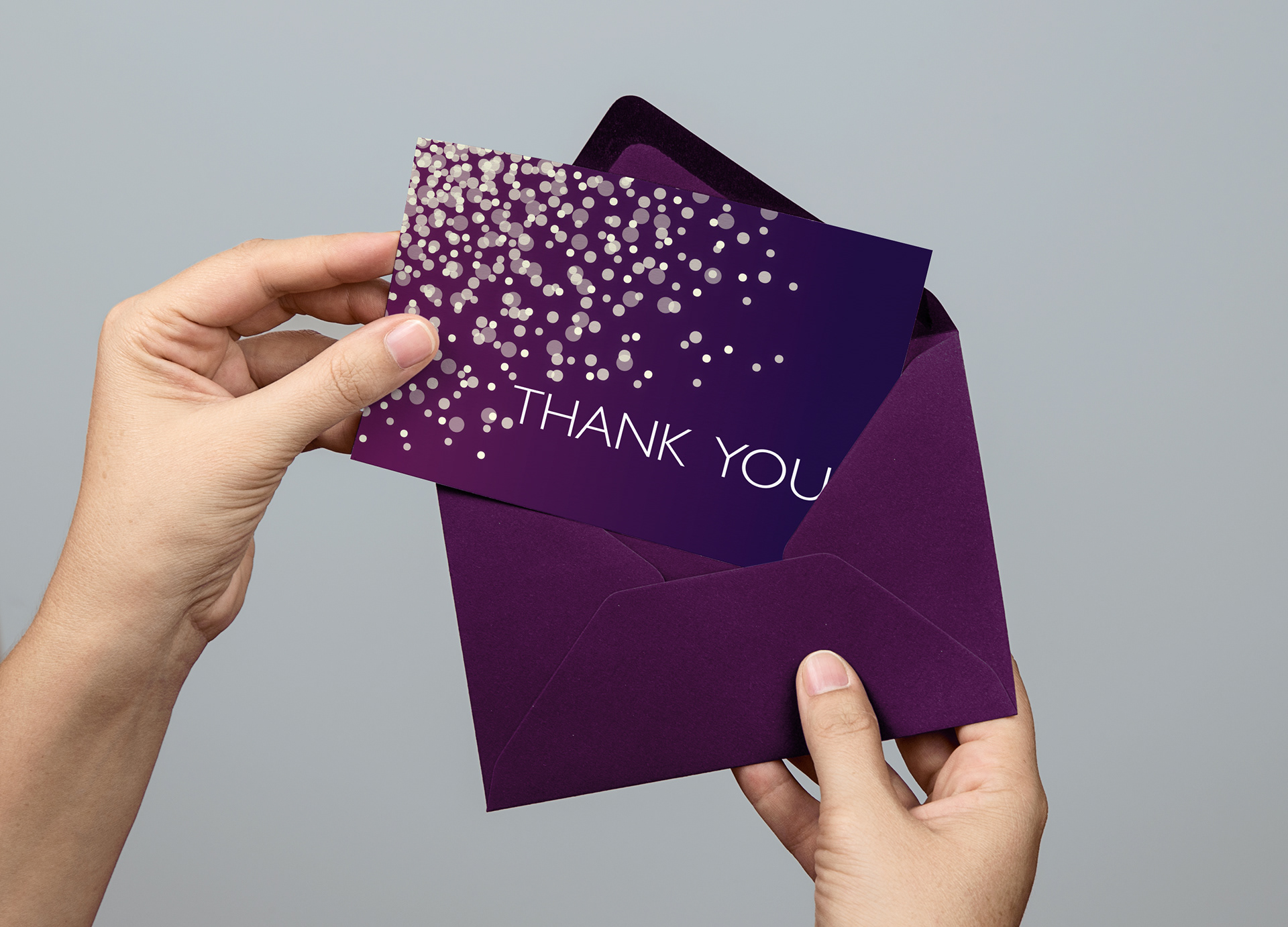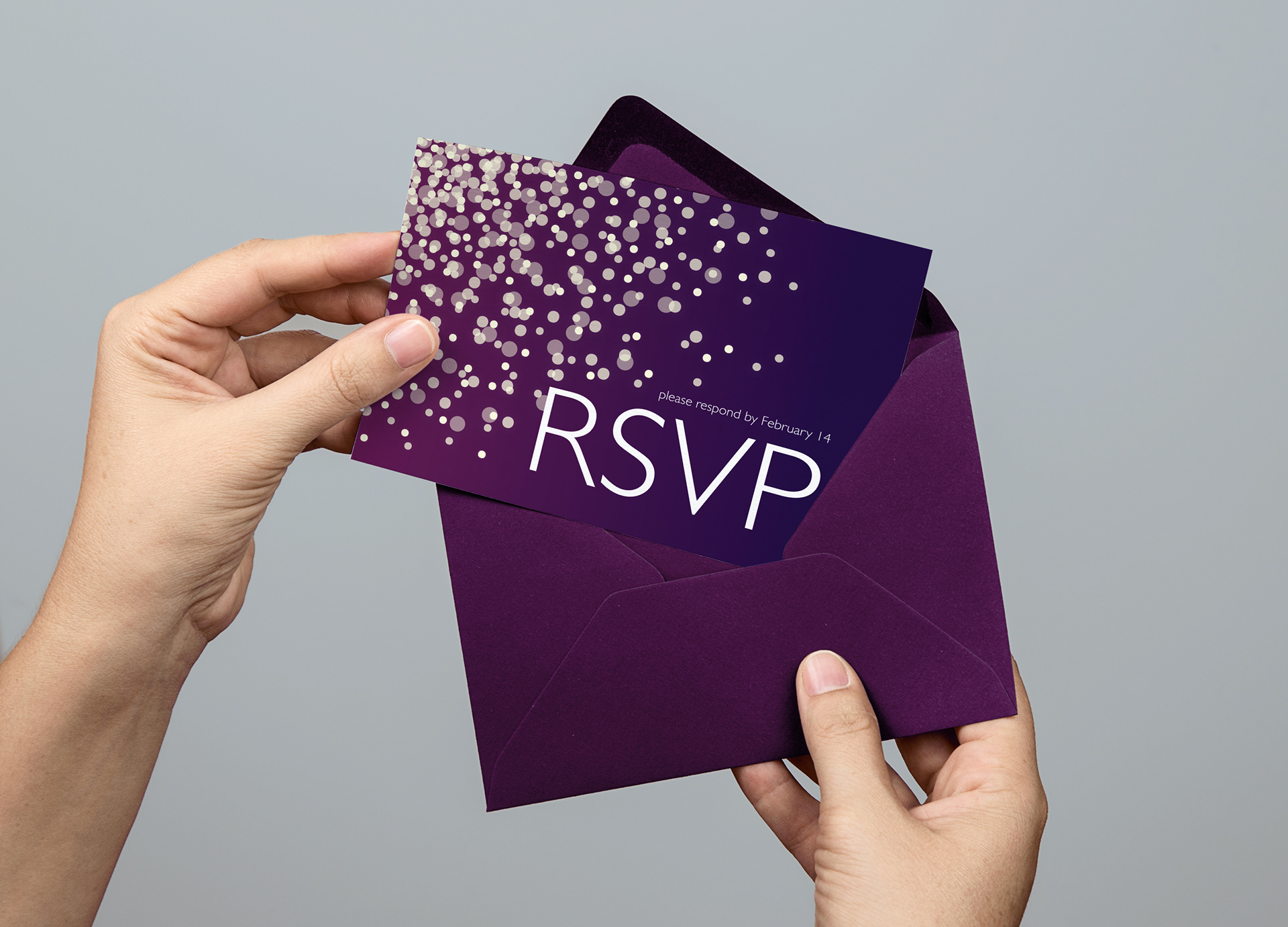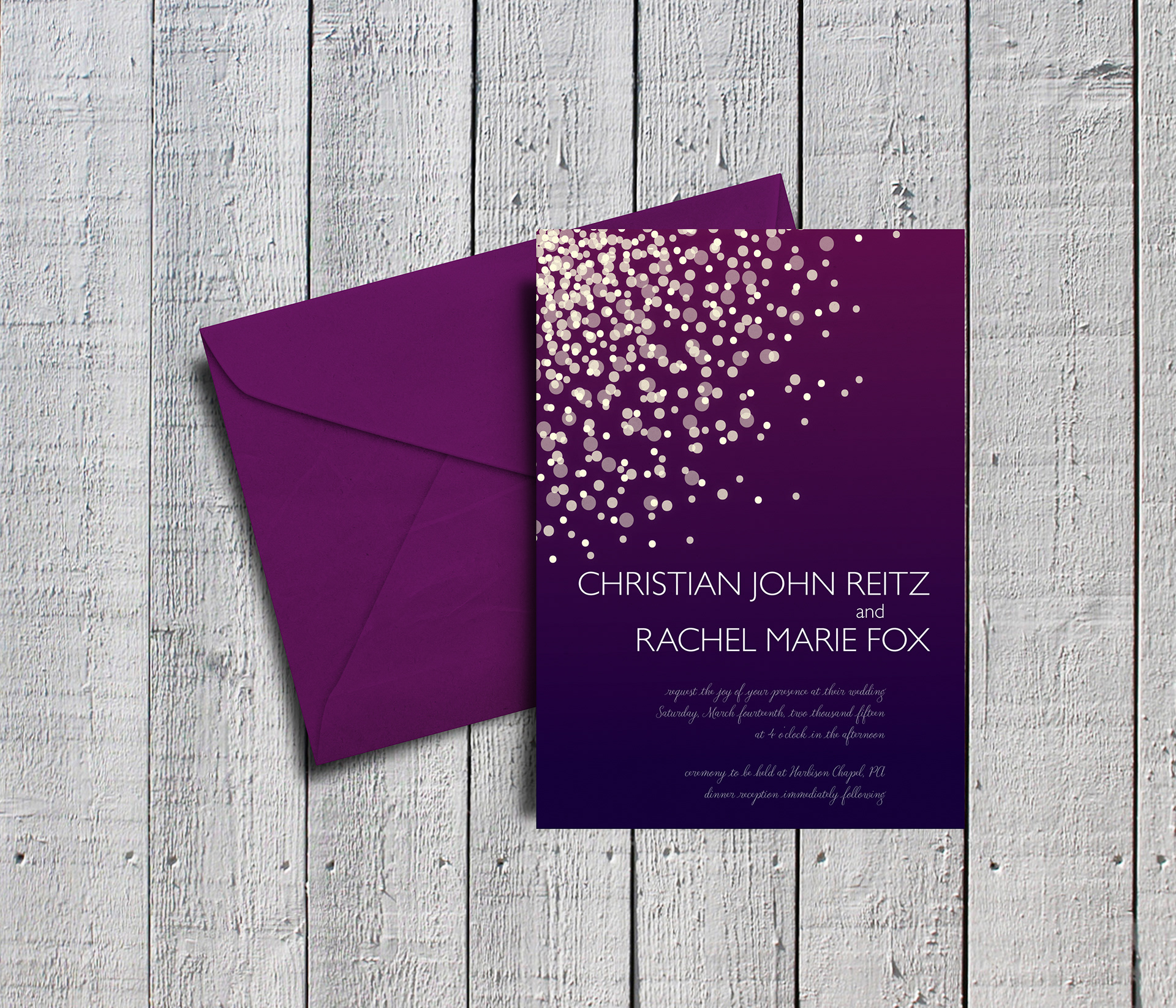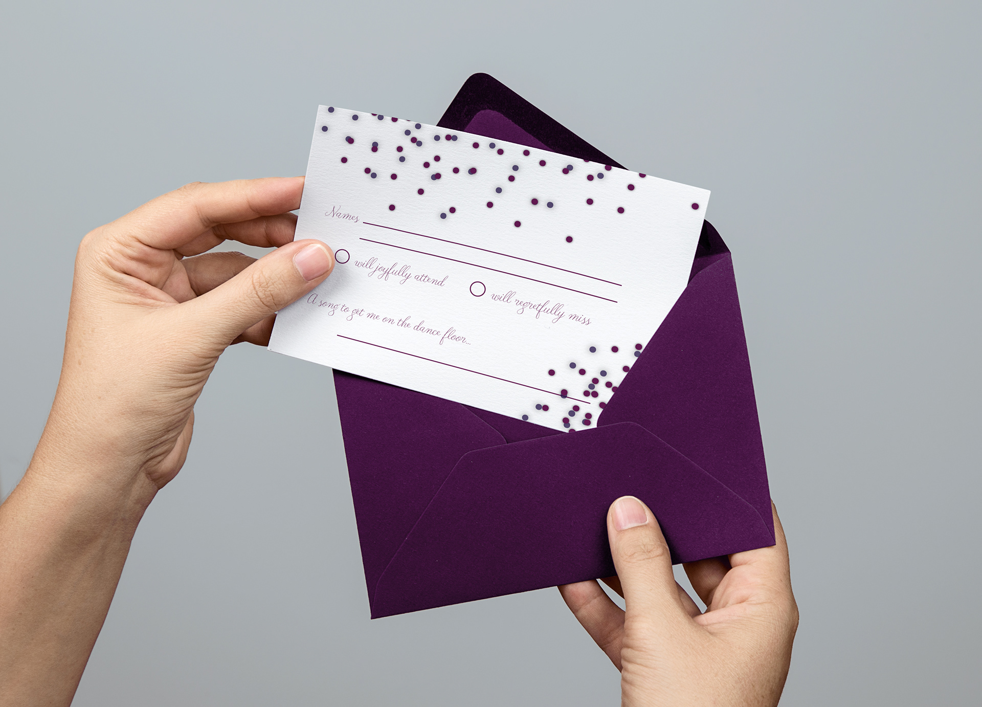 A deep purple & blue wedding stationery suite including an invitation, save the date postcard, additional information card, RSVP card, and thank you card.